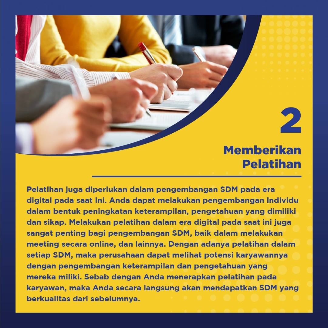 Dalam sebuah perusahaan kualitas sumber daya manusia sangat menentukan kemajuan sebuah bisnis dalam jangka pendek maupun jangka panjang. Dengan sumber daya manusia yang berkualitas, maka akan membawa perusahaan ke arah yang lebih baik. Salah satu cara untuk menjaga kualitas kinerja SDM adalah dengan melakukan pelatihan dan pengembangan sumber daya manusia pada setiap karyawan di era digital pada saat ini.