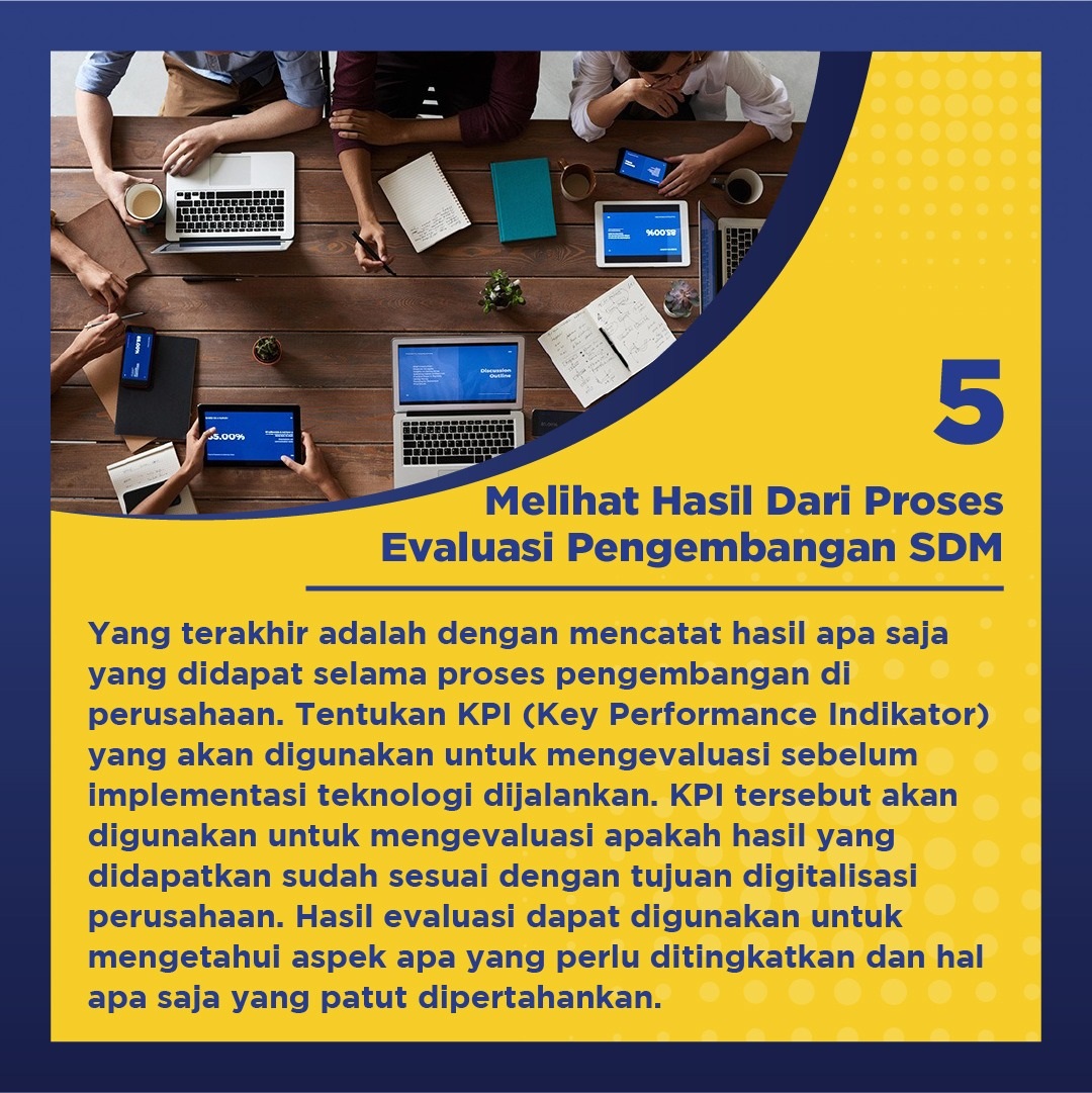Kamu dapat melakukan pembelajaran digital melalui webinar, simulasi, video pelatihan, dan lain sebagainya. Dengan adanya langkah pengembangan SDM secara digital, secara tidak langsung perusahaan dapat menghemat biaya pelatihan maupun biaya perjalanan.