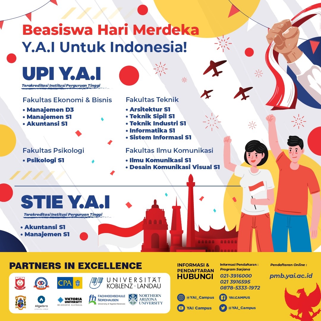 Dalam rangka menyambut Hari Kemerdekaan Republik Indonesia bulan Agustus ini, Y.A.I Campus memberikan Beasiswa Hari Merdeka sampai dengan 100% buat kalian generasi penerus bangsa. SEGERA daftarkan diri kalian sekarang. Program ini berlaku hanya sampai dengan tanggal 17 Agustus 2021 dengan Kuota Terbatas.