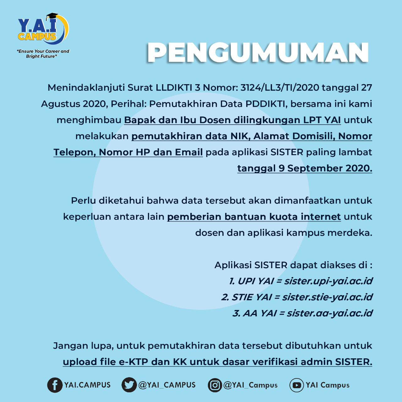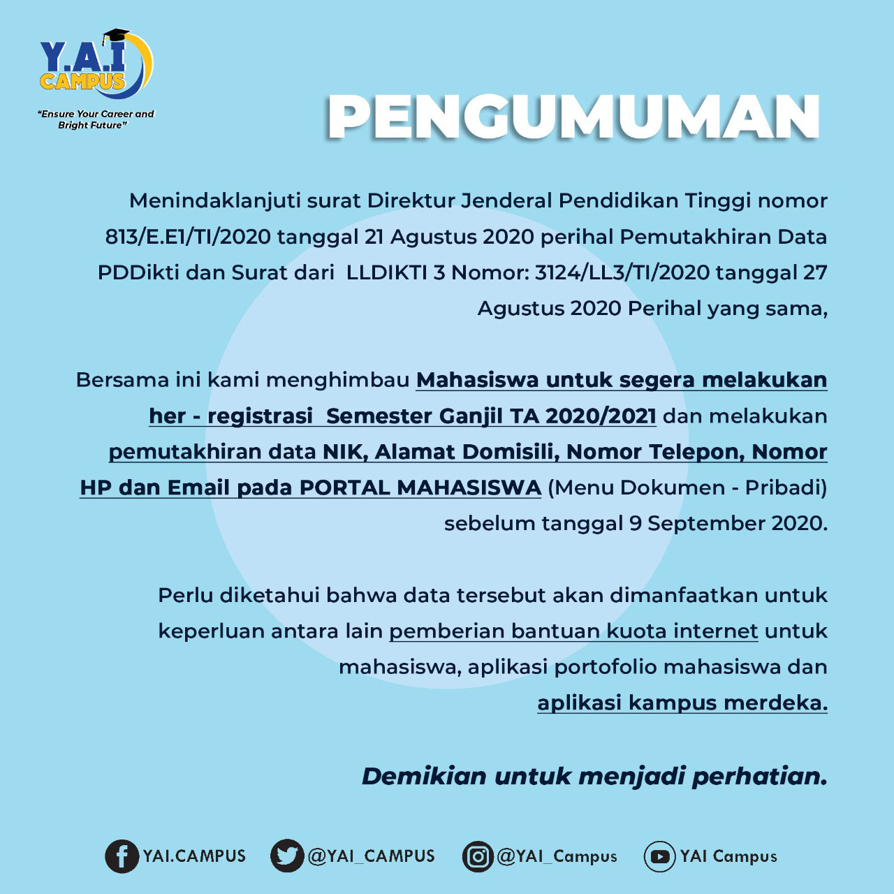 Sehubungan dengan surat Direktur Jenderal Pendidikan Tinggi nomor 813/E.E1/TI/2020 tanggal 21 Agustus 2020 perihal Pemutakhiran Data PDDikti, dan surat Surat LLDIKTI 3 Nomor: 3124/LL3/TI/2020 tanggal 27 Agustus 2020, perihal Pemutakhiran Data. Bersama bersama ini kami menghimbau mahasiswa untuk segera melakukan Her Registrasi Semester Ganjil Tahun Akademik 2020/2021 dan melakukan pemutakhiran data. Dan kami juga menghimbau Bapak dan Ibu Dosen dilingkungan LPT Y.A.I untuk melakukan pemutakhiran data terkait biodata dosen.
