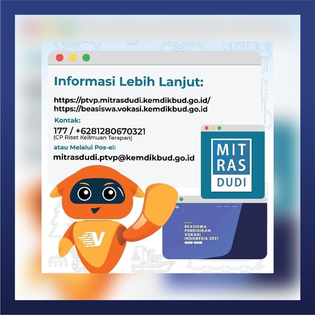 Hai #SobatVokasi, kali ini #Mika ingin menginfokan mengenai Program Riset Keilmuan Terapan Dalam Negeri Dosen PT Vokasi 2021 nih! Yuk, simak info selengkapnya melalui infografis tersebut ya!