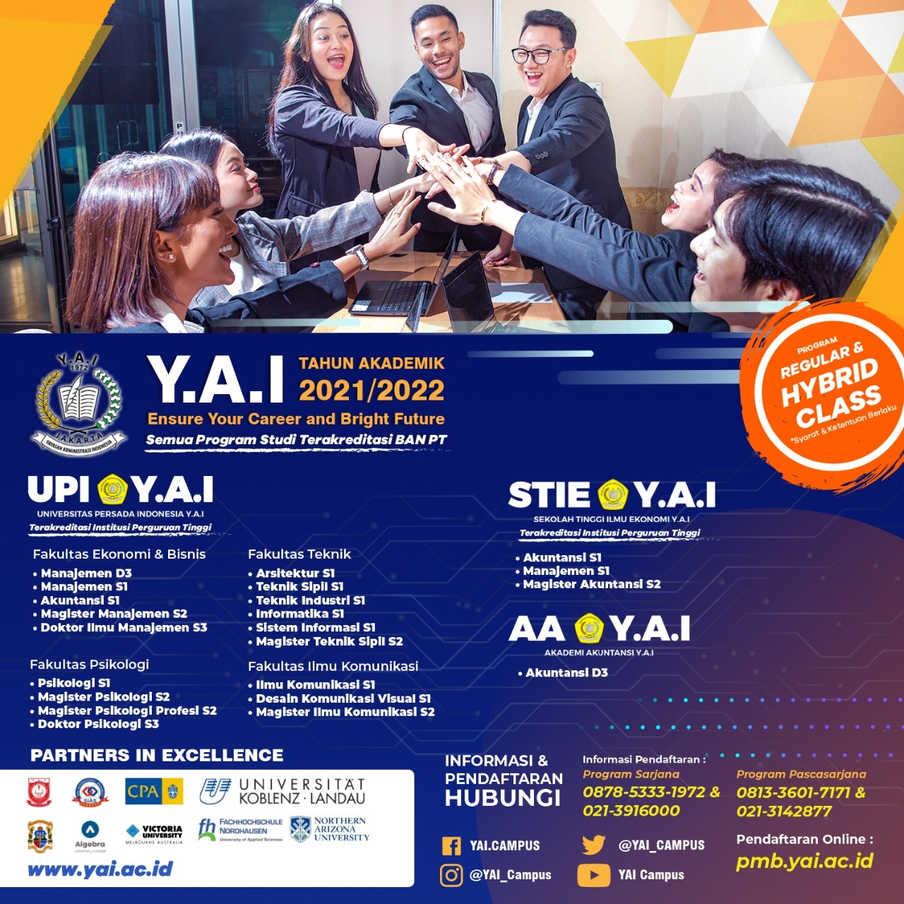 Masih galau berat mau lanjut kuliah dimana saat ini, bingung nyari kampus yang bagus dari segi akreditasi, program studi, lokasi, biaya, dll? Yuuk saatnya kamu liat-liat Y.A.I Campus bagi kalian Lulusan SMA/SMK dan Sederajat, Y.A.I Campus membuka Program Hybrid Class lho. Program ini bertujuan untuk memudahkan proses pembelajaran ditengah pandemi Covid 19. Biaya kuliahnya sangat terjangkau lho dengan skema pembayaran yang berbeda dengan biasanya. Selain itu sistem perkuliahannya fleksibel dengan berbasis pembelajaran Online dan Offline, dimana kamu bisa mendapatkan kemudahan akses perkuliahan sesuai dengan waktu dan mobilitas. Nggak cuma itu, jika kamu mengikuti Program Hybrid Class kamu juga bisa pindah kapan saja ke offline class*. Lokasi Y.A.I Campus juga strategis banget karena berada di Pusat Kota Jakarta.