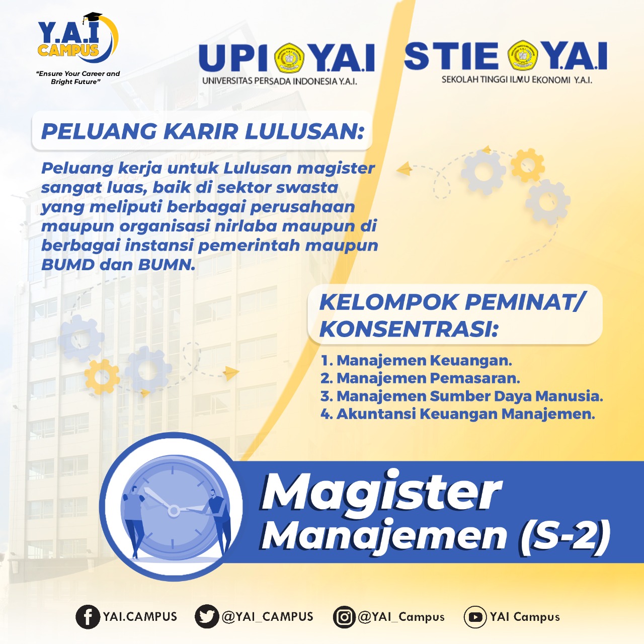 Siapkan dirimu meraih karir impian dengan pendidikan berkualitas. Bersama Y.A.I Campus, mari tingkatkan kualitas karir menjadi lebih tinggi lagi. Bagi Anda Alumni Y.A.I Campus/Pegawai Negeri Sipil/Pegawai BUMN/Karyawan Swasta/Wirausaha/Praktisi dan lain-lain yang ingin mengembangkan kompetensi, kualitas dan kapasitas diri ke arah yang lebih baik, mari bergabung dengan Civitas Akademika Pascasarjana Y.A.I Campus Y.A.I Campus memiliki Program Magister dan Program Doktoral yang telah terakreditasi oleh Badan Akreditasi Nasional Perguruan Tinggi. Sistem pembelajaran kurikulum berbasis kompetensi, Variasi pilihan Program Studi, Lokasi kampus strategis, Jadwal kuliah fleksibel, dan Biaya kuliah terjangkau, merupakan alasan utama mengapa Anda harus memilih Y.A.I Campus Selain itu, tersedia berbagai Program Beasiswa yaitu Beasiswa Khusus Alumni 20%, Beasiswa Akademik dan Non Akademik Up To 50% (Syarat dan Ketentuan Berlaku), anda cukup #dirumahaja. Untuk proses PENDAFTARAN dilakukan secara ONLINE melalui pmb.yai.ac.id. Daftar sekarang! Informasi lebih lanjut: Call Center 0813 3601 7171 Telp. 021-314 28 77 Jam Operasional: Senin s/d Jum'at | Pukul 09.00 - 17.00 WIB Sabtu | Pukul 09.00 - 15.00 WIB