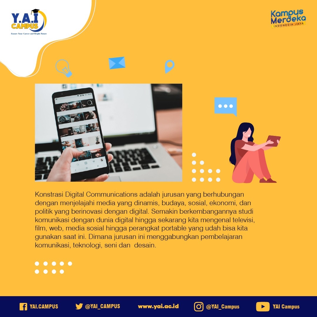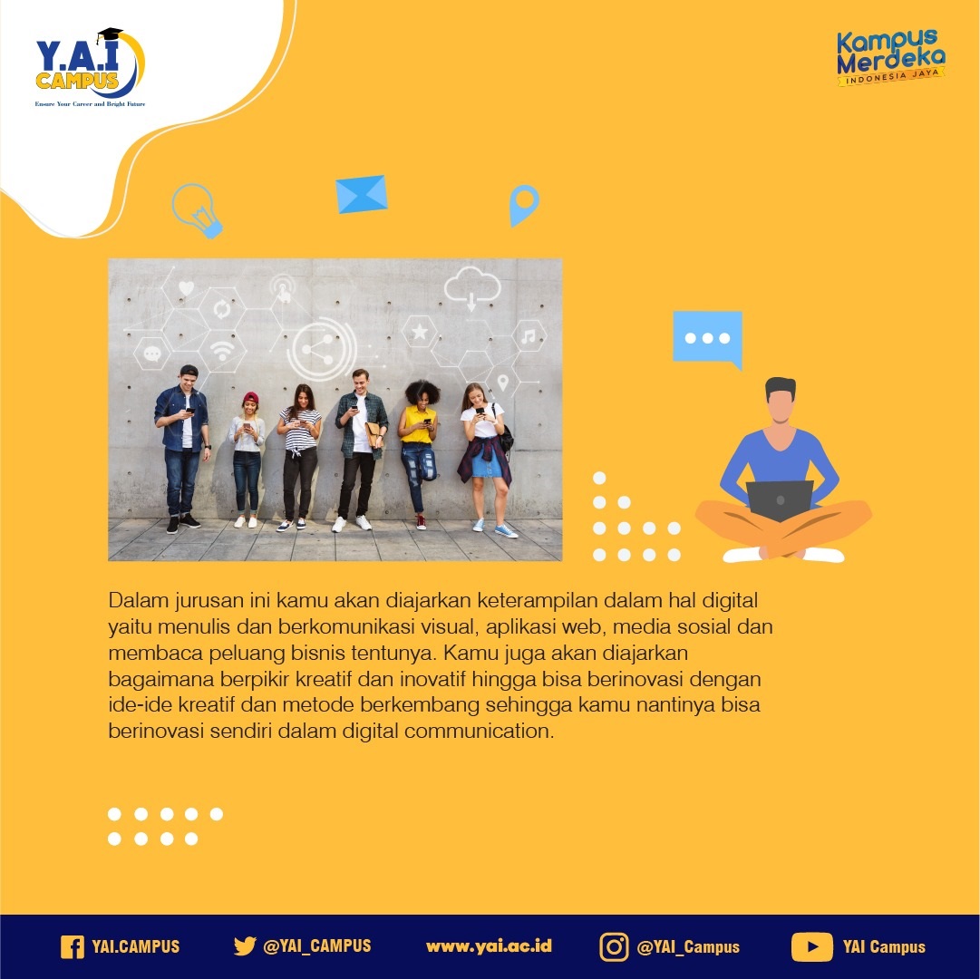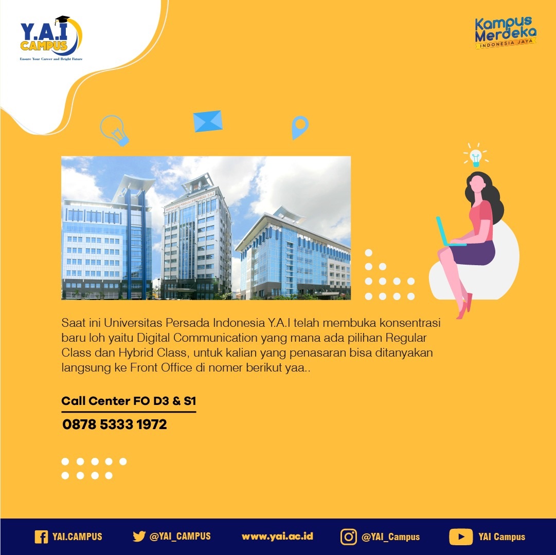 Good news! Fakultas Ilmu Komunikasi Universitas Persada Indonesia Y.A.I dengan Program studi Ilmu Komunikasi telah membuka peminatan/ konsentrasi Digital Communication dengan pembelajaran Regular Class dan Hybrid Class yang bisa kalian pilih.