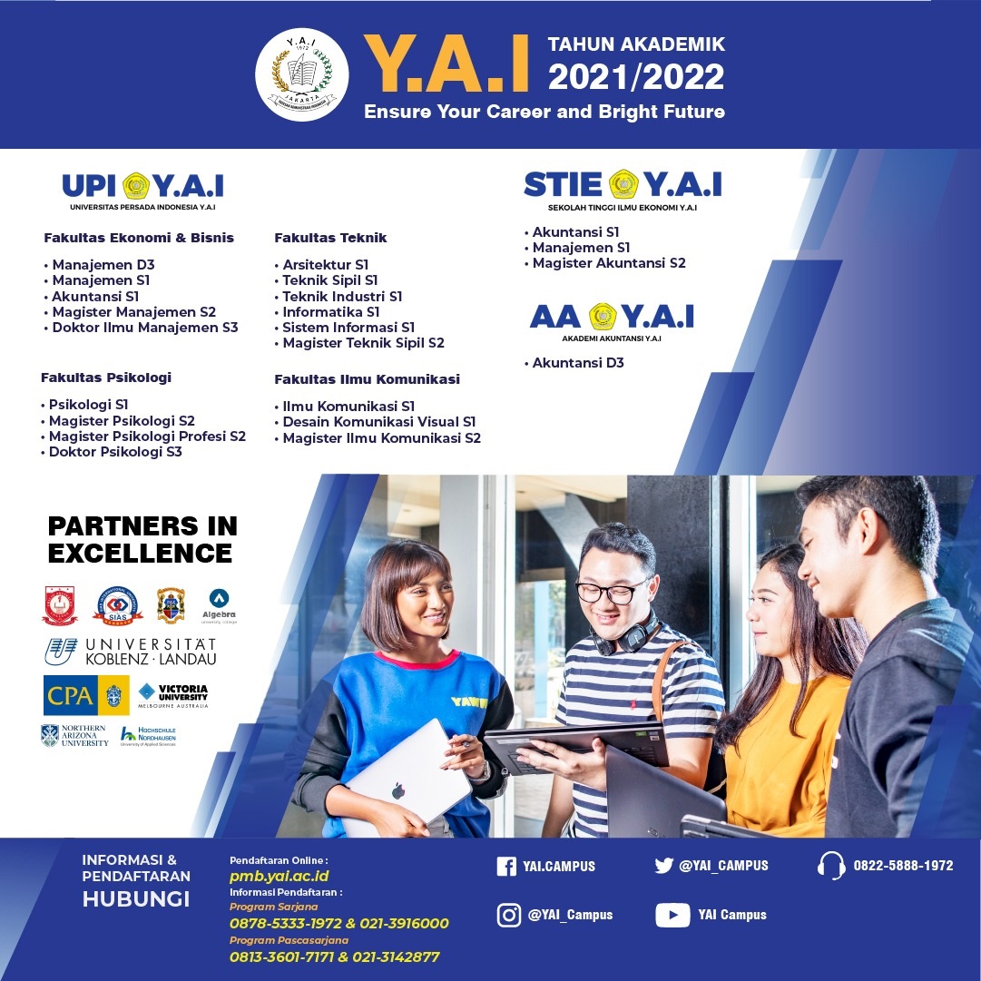 Lembaga Pendidikan Tinggi Y.A.I (UPI Y.A.I - STIE Y.A.I - AA Y.A.I) merupakan Perguruan Tinggi Swasta Terbaik berlokasi di Jakarta Pusat, yang memiliki program studi yang dapat kalian pilih sesuai dengan passion kalian dan tentunya udah terakreditasi. Selain itu ada pilihan kelas reguler yang cocok buat kalian yang memang ingin fokus kuliah saja atau buat kalian yang mungkin udah kerja atau dalam waktu dekat mau kerja bisa juga pilih kelas hybrid karena waktu kuliahnya fleksibel bangett...