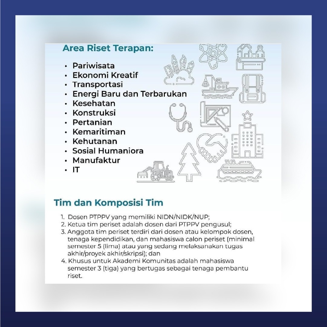 Hai #SobatVokasi, kali ini #Mika ingin menginfokan mengenai Program Riset Keilmuan Terapan Dalam Negeri Dosen PT Vokasi 2021 nih! Yuk, simak info selengkapnya melalui infografis tersebut ya!