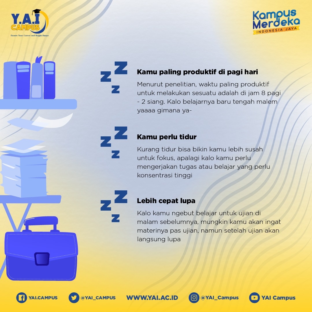 Saat menjadi mahasiswa, pasti sering mendengar belajar sistem kebut semalam. Hal ini biasanya jika pagi hari mau ada ujian, baru malam sebelumnya belajar. Atau biasanya adalah belajar ketika mau ada ujian saja. Malam hari mempelajari satu mata kuliah yang akan diujikan esok harinya. Jika kalian pernah melakukan, itu adalah hal yang wajar. Tetapi, belajar sistem kebut semalam itu apakah efektif? Karena yang ada nanti malah badan menjadi drop. Selama bisa kamu cicil dari jauh-jauh hari, mendingan dicicil deh. Yang ada kamu jadi susah fokus karena kecapekan dan kurang tidur habis begadang.
