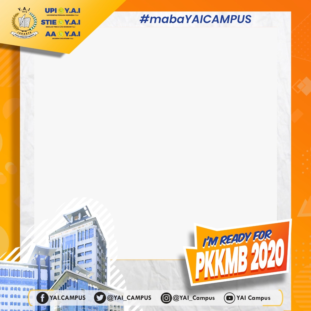 Hallo Y.A.I Friends, Saya (nama) Mahasiswa Baru (UPI Y.A.I/STIE Y.A.I/AA Y.A.I), (Fakultas & Jurusan). Saya siap mengikuti kegiatan PKKMB Y.A.I Campus 2020 dan saya siap menjadi mahasiswa Y.A.I Campus yang adaptif, produktif, inovatif dan kontributif. Saya bangga menjadi bagian Y.A.I Campus.